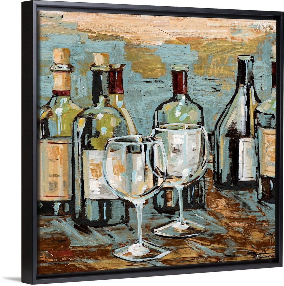 <p>Artwork perfect for the home or kitchen of different types of wine bottles with two wine glasses sitting in front empty.</p>