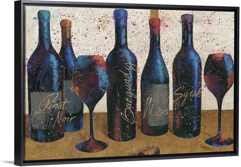 <p>Painting of five bottles of wine and a couple of wine glasses, with paint platters for added effect.</p>