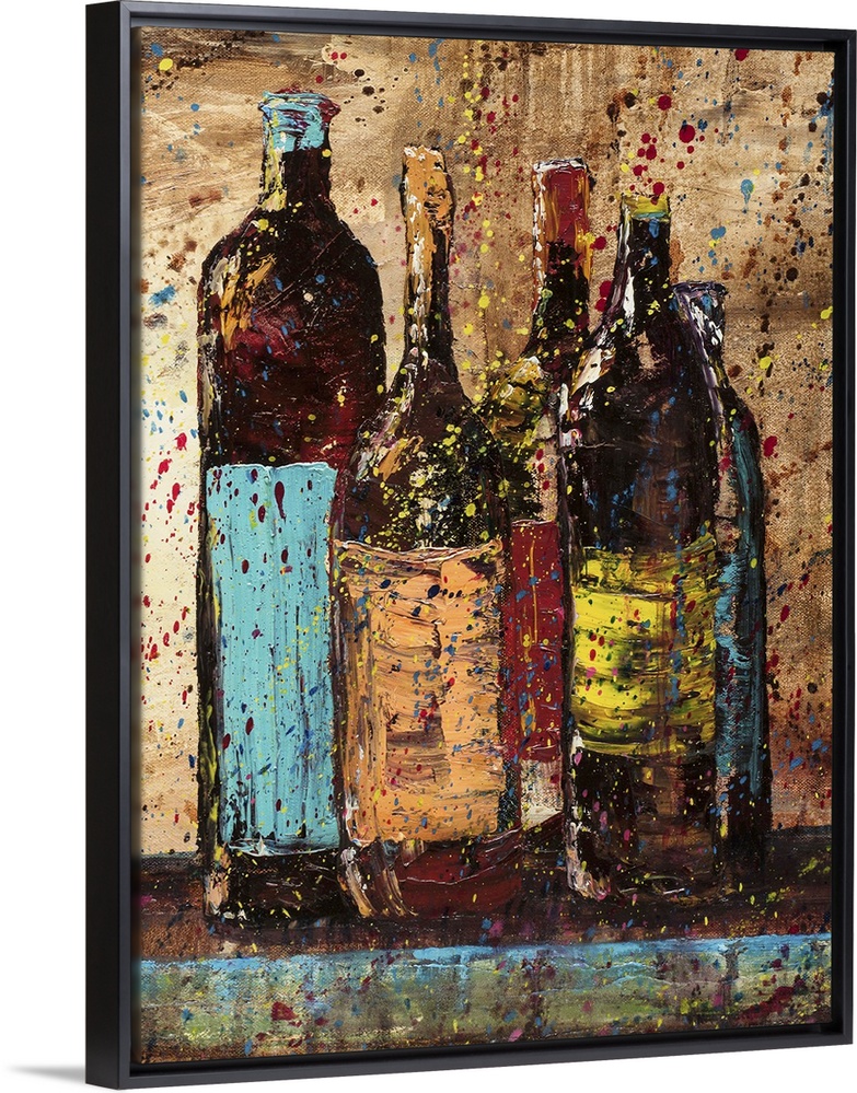 <p>Painting of wine bottles with brightly colored labels on a shelf with a neutral colored background covered in colorful paint splatter.</p>