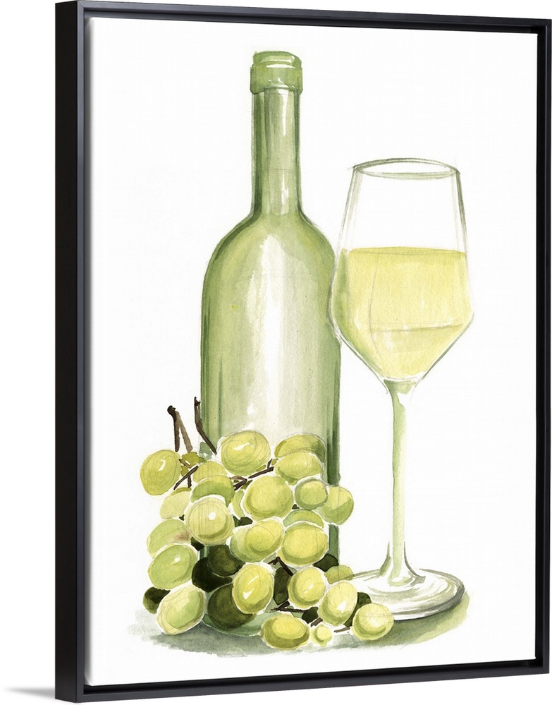 <p>A watercolor painting of a glass of white wine accompanied by grapes and green bottle fills this vertical contemplative artwork.</p>