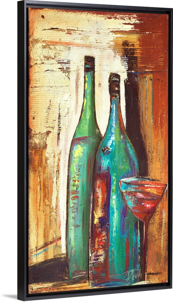 <p>A rustic abstract painting of two bottles and glass of red wine.</p>