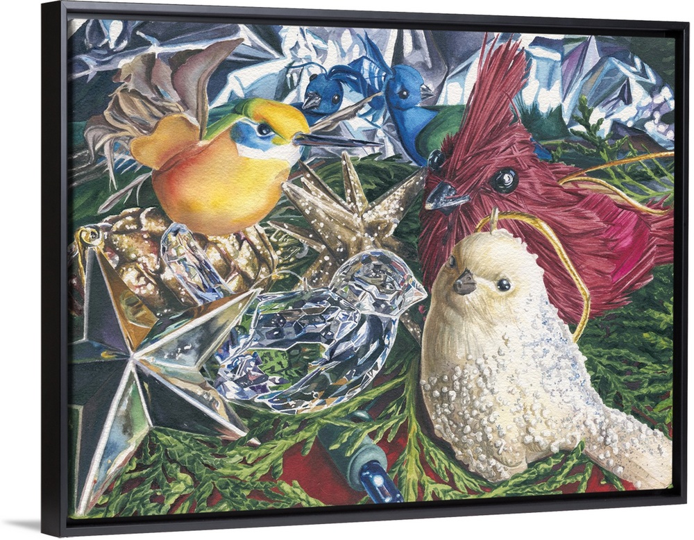 <p>A handful of tree ornaments--most of them birds--helped me create a watercolor that can be viewed as a secular or religious Christmas image. On the surface, this is a grouping of cute birds on some greenery, a red stocking, and some aluminum foil. But if you want to dig deeper, this is a non-traditional nativity scene. The white bird and cardinal are Mary and Joseph (note their gold cord halos). The otherworldly crystal bird is the baby Jesus. He is tucked under a star, wears a glittery crown, and beneath him is a light. The hummingbird offers him a golden pine cone, and the two other kings are peacocks. (Perhaps they have misplaced their frankincense and myrrh and are looking for it.)</p>