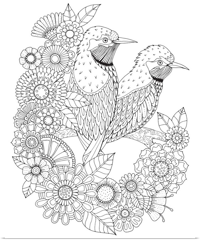 <p>Black and white line art of two birds perched on a branch and surrounded by flowers.</p>