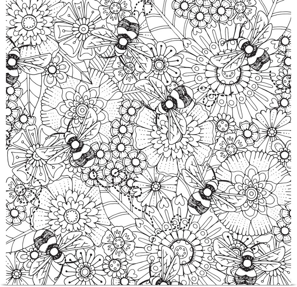 <p>Black and white lined design of a pattern with bumble bees and flowers.</p>