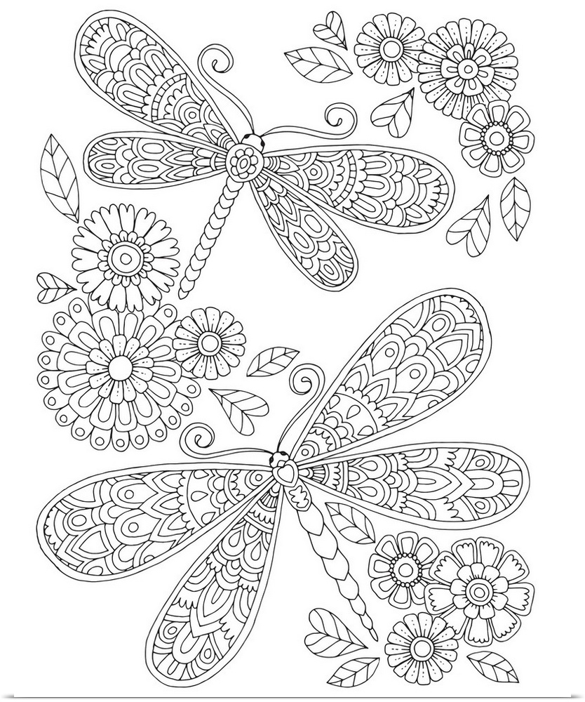 <p>Black and white line art of two intricately designed butterflies surrounded by flowers.</p>