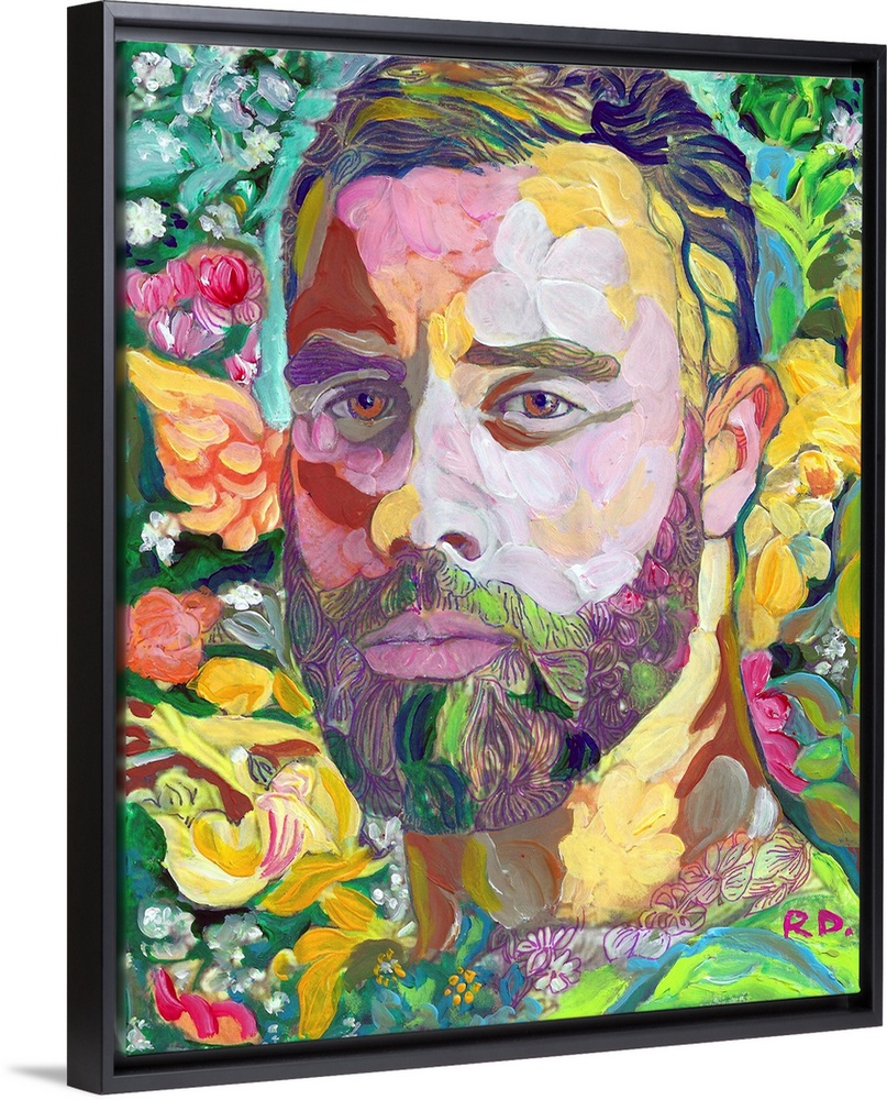 <p>Painting of a handsome bearded man surrounded by florals, splashes and pops of color.</p>