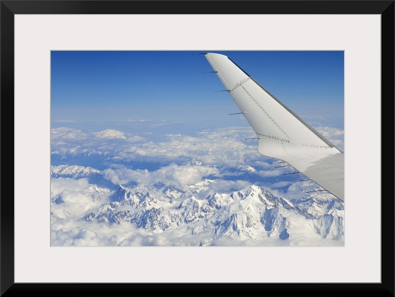 <p>Wings of flying airplane over French Alps, France, (aerial view)</p>