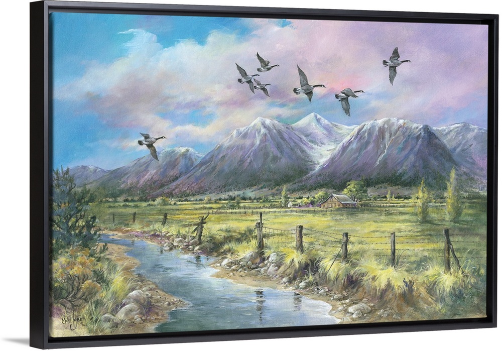<p>Contemporary painting a mountainous valley and an old barn in the distance, with geese flying overhead.</p>