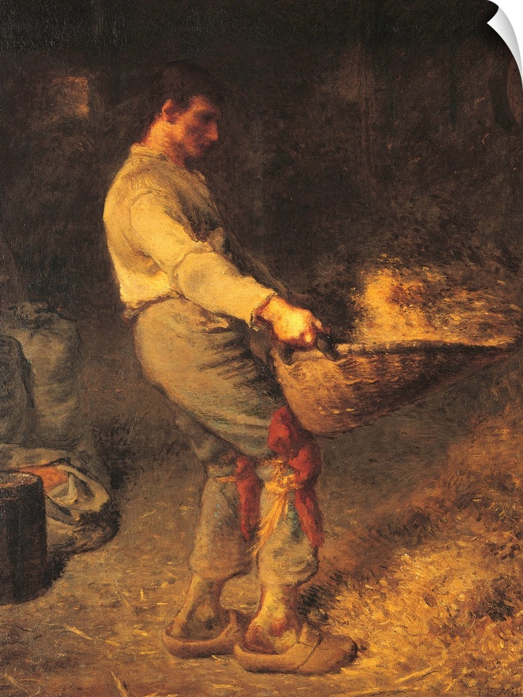 <p>A Winnower, by Jean-Franois Millet, 1866 - 1868, 19th Century, oil on canvas, cm 79 x 58 - France, Ile de France, Paris, Muse dOrsay, RF1874. All. Young peasant willowing wheat shoes trousers barn straw sacks. (273045) Everett Collection\Mondadori Portfol</p>