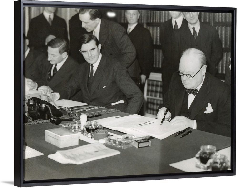 <p>Winston Churchill signing the 'Lend Lease' agreement to lease British bases to the U.S. March 11, 1941. From his desk at 10 Downing Street, Churchill and U.S. Ambassador, John G. Winant, sign An Act to Further Promote the Defense of the United States'.</p>