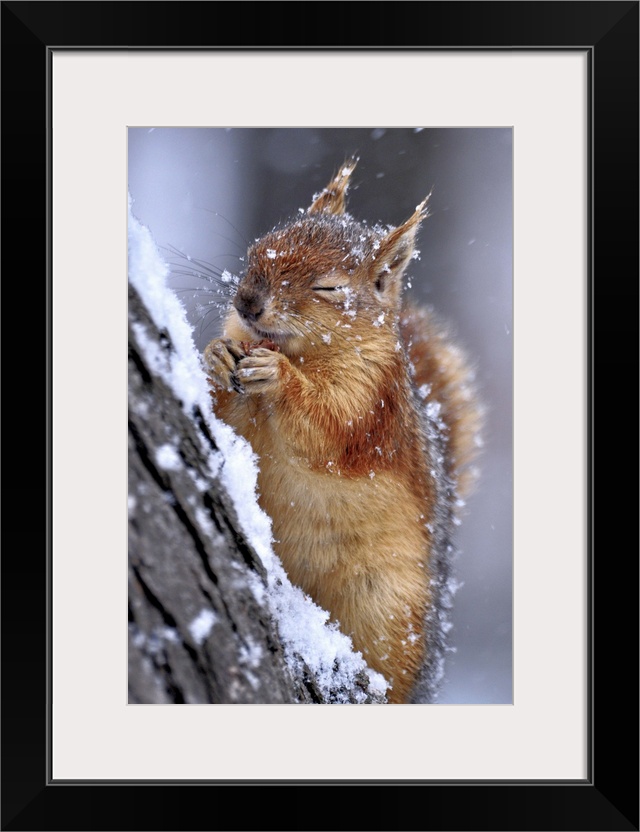 <p>Portrait of a red squirrel on a tree in winter, closing its eyes from falling snow.</p>