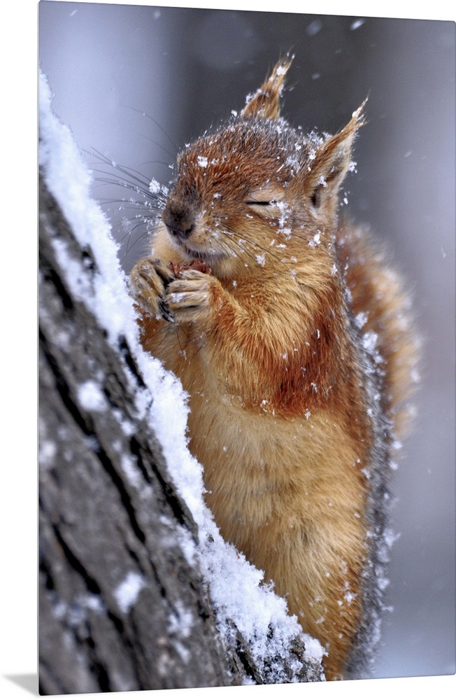 <p>Portrait of a red squirrel on a tree in winter, closing its eyes from falling snow.</p>