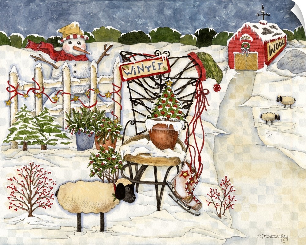 <p>Barn with path leading to fence with snowman, sheep, tiny trees, and a chair with a hat and a sign that reads: winter.</p>