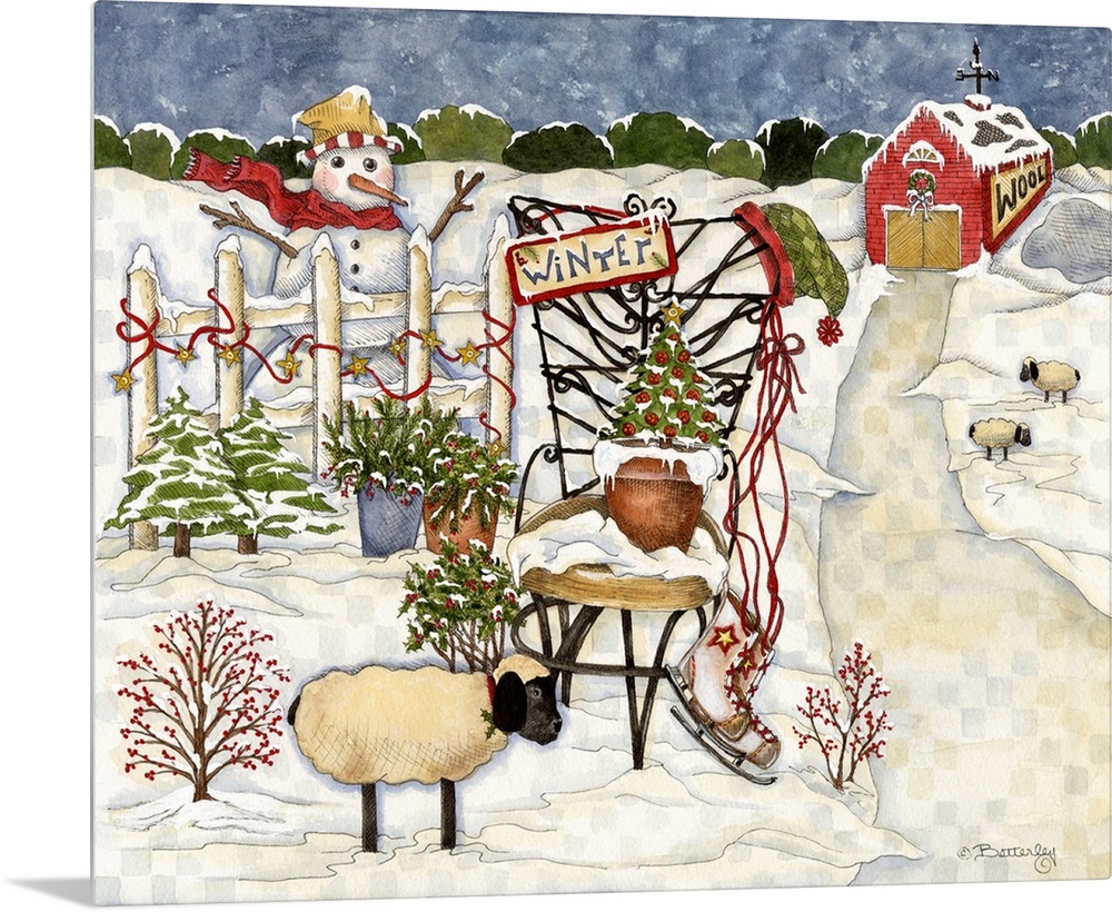 <p>Barn with path leading to fence with snowman, sheep, tiny trees, and a chair with a hat and a sign that reads: winter.</p>