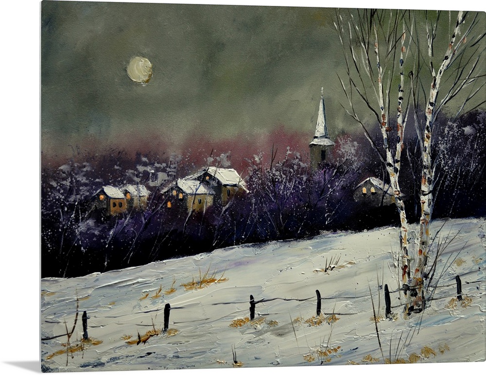 <p>A wintry nighttime scene of a field covered in snow with a village in the background.</p>