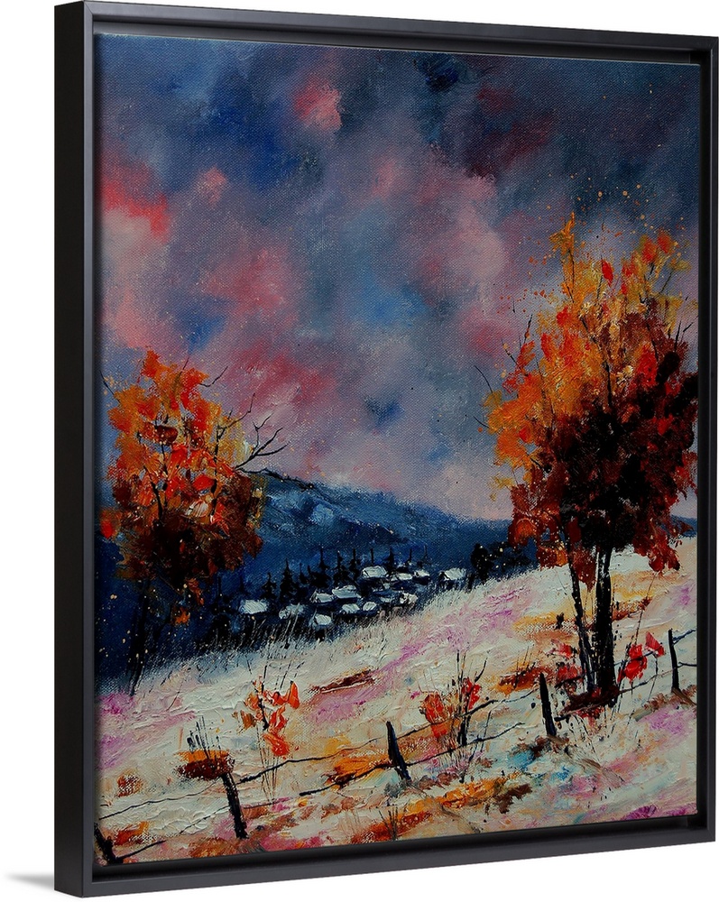 <p>Painting of a fenced snow cover field and vibrant red leaved trees with a pink and blue sky.</p>
