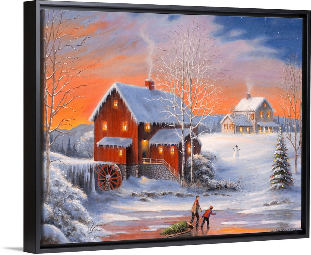 <p>Old Mill, water wheel, tree, icewinter father/son pulling Christmas tree</p>