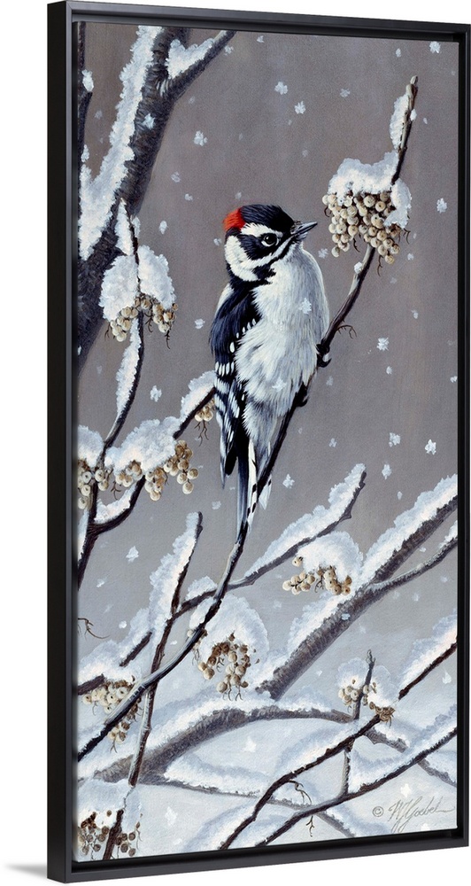 <p>Downy Woodpecker eating berries off a snowy branch.</p>