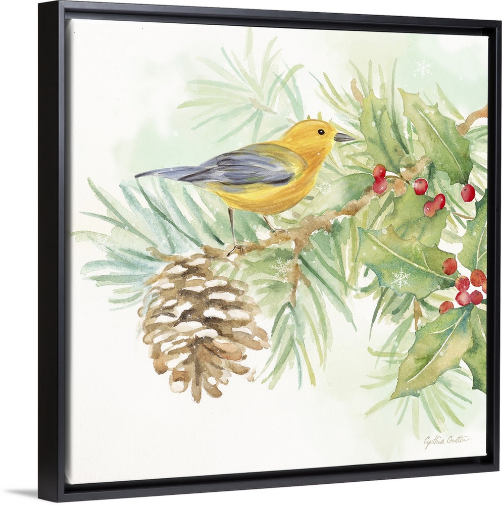 <p>Square artistic painting of a bird perched on a tree branch with small snow flakes falling.</p>