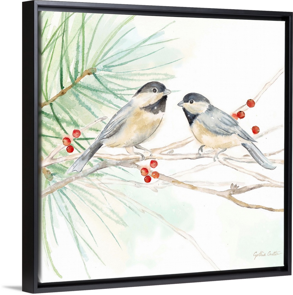 <p>Square artistic painting of a pair of birds perched on a tree branch.</p>