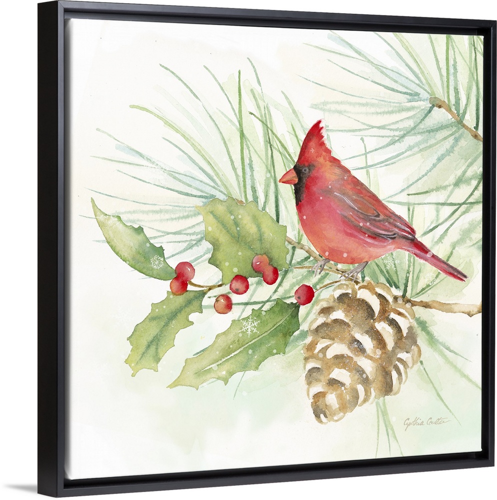 <p>Square artistic painting of a bird perched on a tree branch with small snow flakes falling.</p>