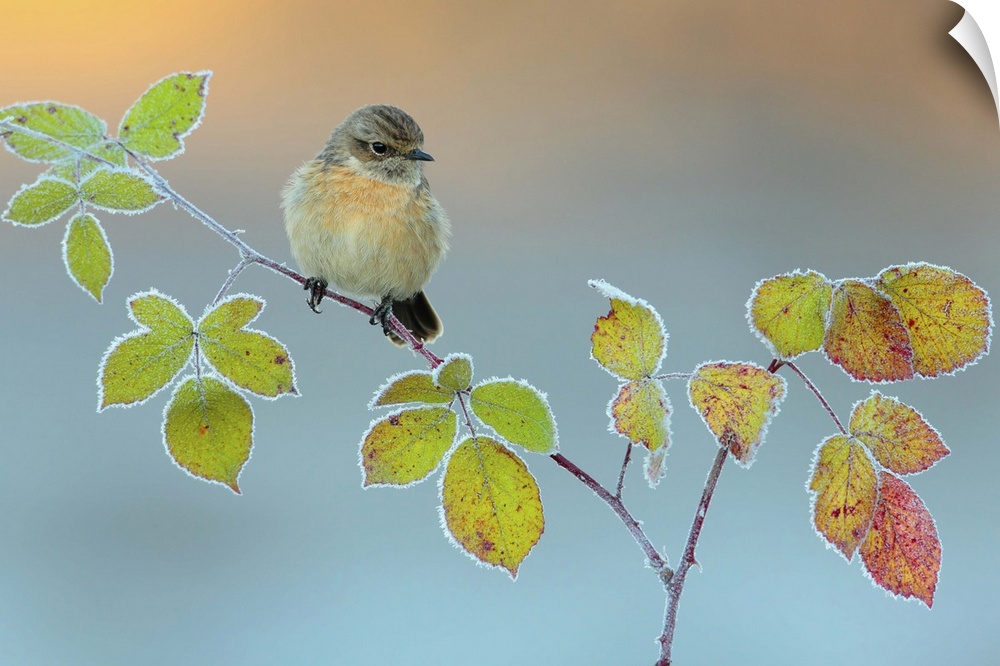 <p>A Common Stonechat perched on a thin branch with frost on the leaves.</p>