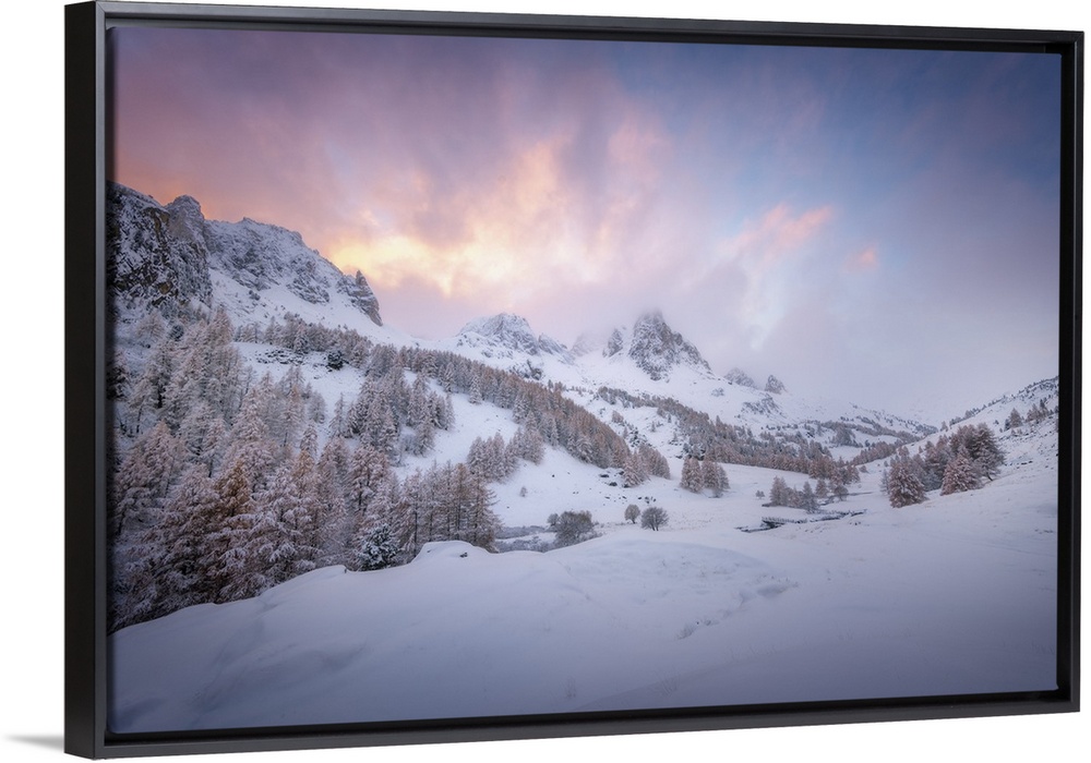 <p>Colored sunset landscape scene on a snowy mountain in the Alpes in France. A pine valley in winter during a quiet moment.</p>