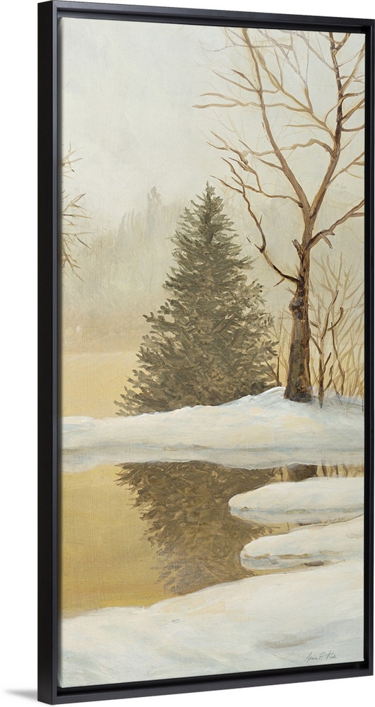 <p>Contemporary painting of a forest clearing seen through fog in winter.</p>