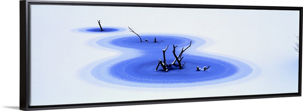 <p>Twigs protrude out of frozen water in three different spots and are surrounded by snow.</p>