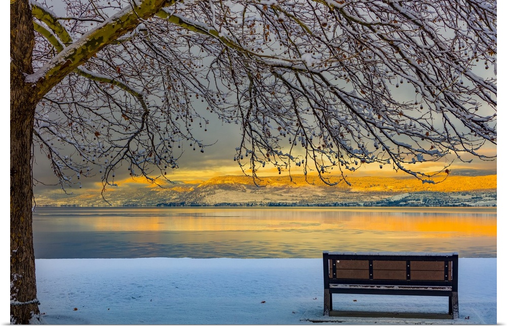 <p>Winter in the Okanagan Valley on the Kelowna beach; Kelowna, British Columbia, Canada</p>
