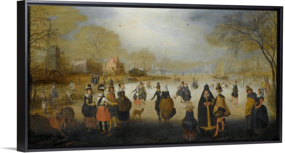 <p>Winter Landscape with Skaters, by Hendrick Avercamp, 1615-20, Dutch painting, oil on panel. In the foreground are men and women in luxurious clothing and jewelry. In the distance is a skyline of a city.</p>