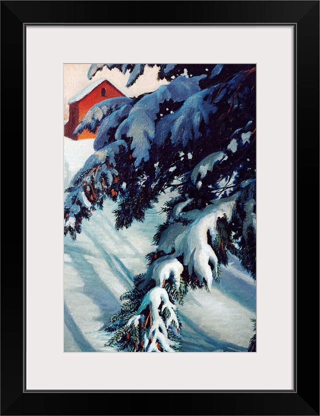 <p>Contemporary artwork of tree branches laden with snow in front of a barn.</p>