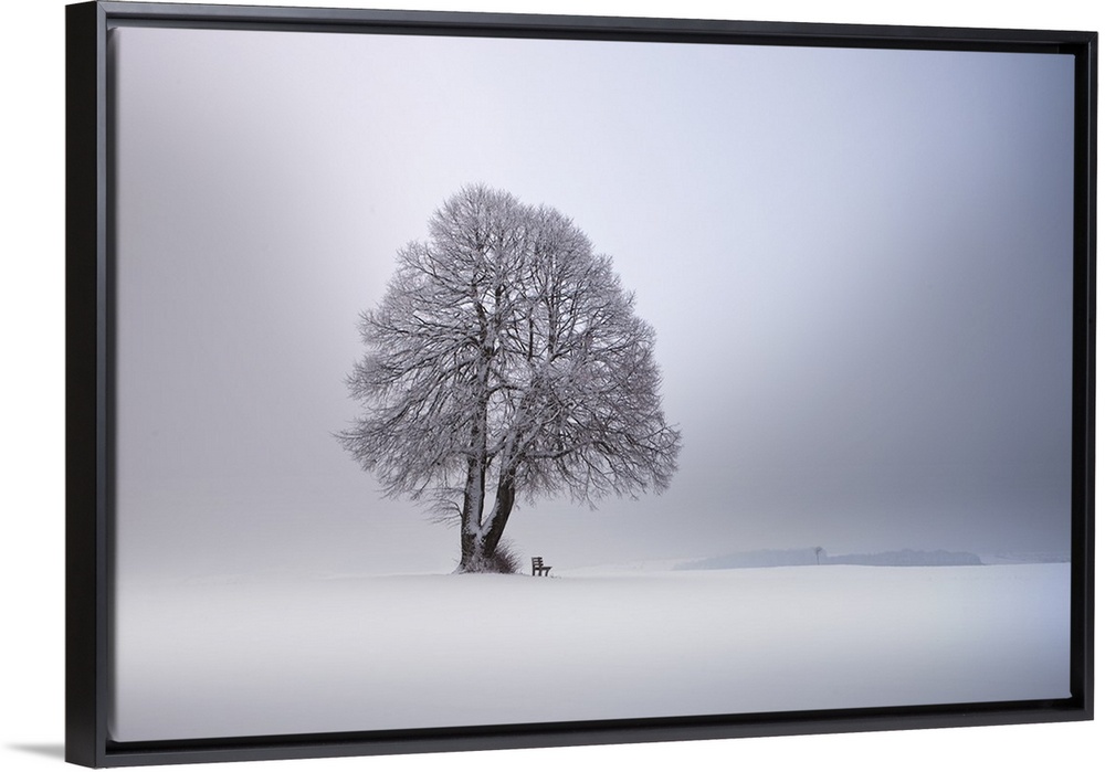<p>A lone tree in a snow-covered landscape wit ha small bench, Germany.</p>