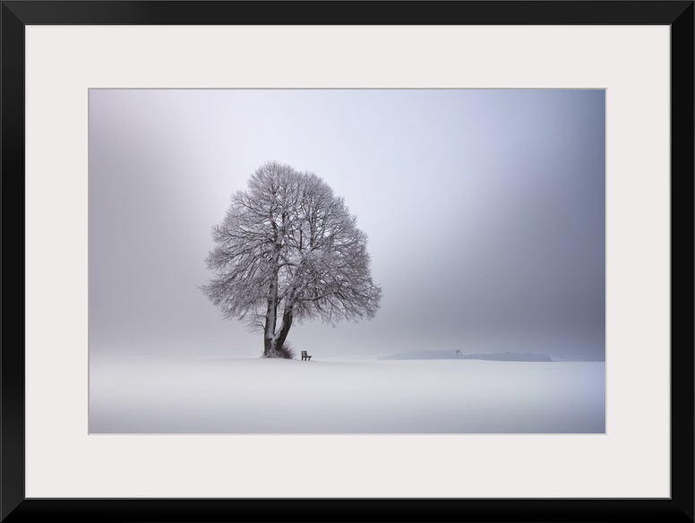 <p>A lone tree in a snow-covered landscape wit ha small bench, Germany.</p>