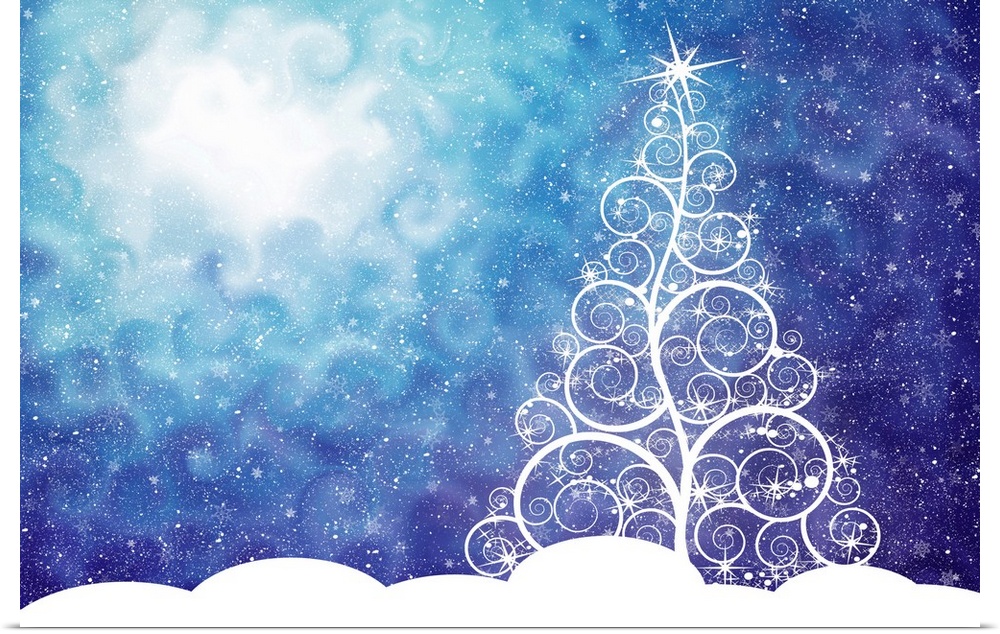 <p>A white silhouette of a Christmas tree standing in snow, with snow falling in an illuminated night sky.</p>