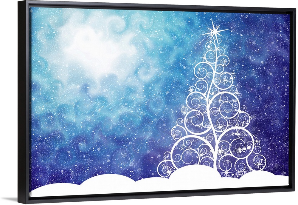<p>A white silhouette of a Christmas tree standing in snow, with snow falling in an illuminated night sky.</p>
