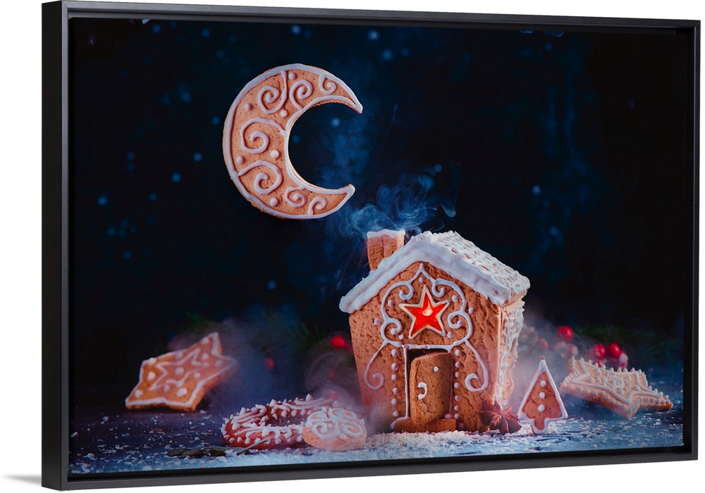 <p>Christmas baking concept with a gingerbread house, shining caramel windows, biscuit moon crescent and rising smoke from a chimney festive food photography.</p>