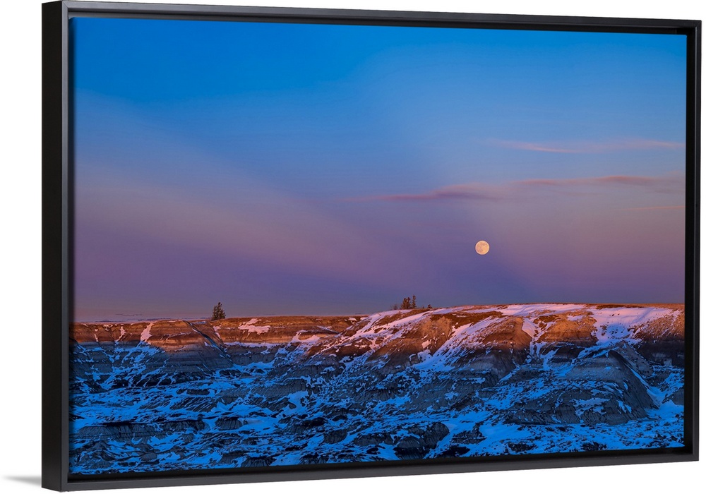 <p>Winter moonrise in crepuscular rays over the badlands of Horseshoe Canyon, Alberta, Canada</p>
