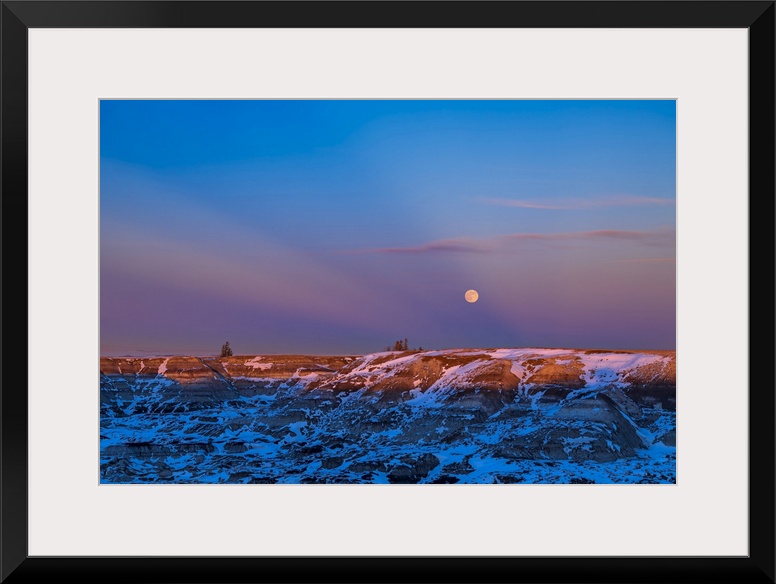 <p>Winter moonrise in crepuscular rays over the badlands of Horseshoe Canyon, Alberta, Canada</p>