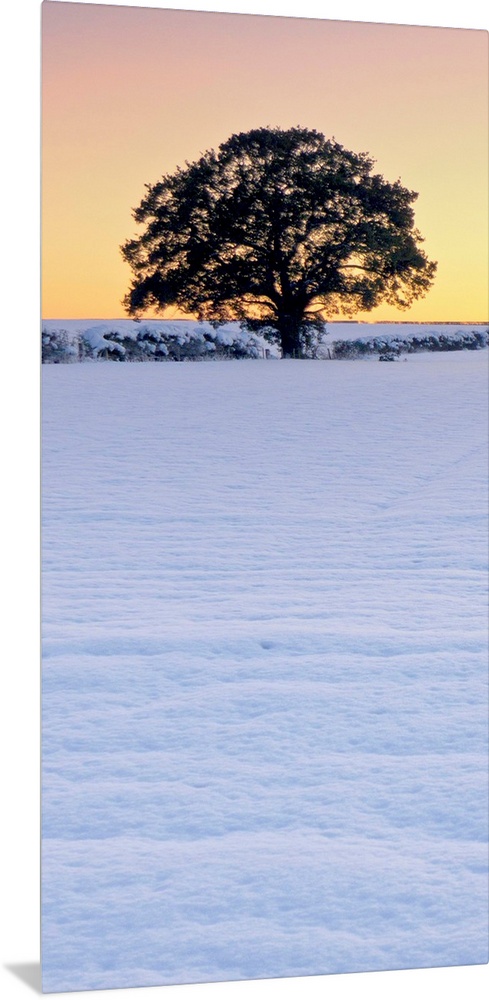 <p>A vertical panorama of a winter leafless tree against a golden yellow gold sky in snow.</p>