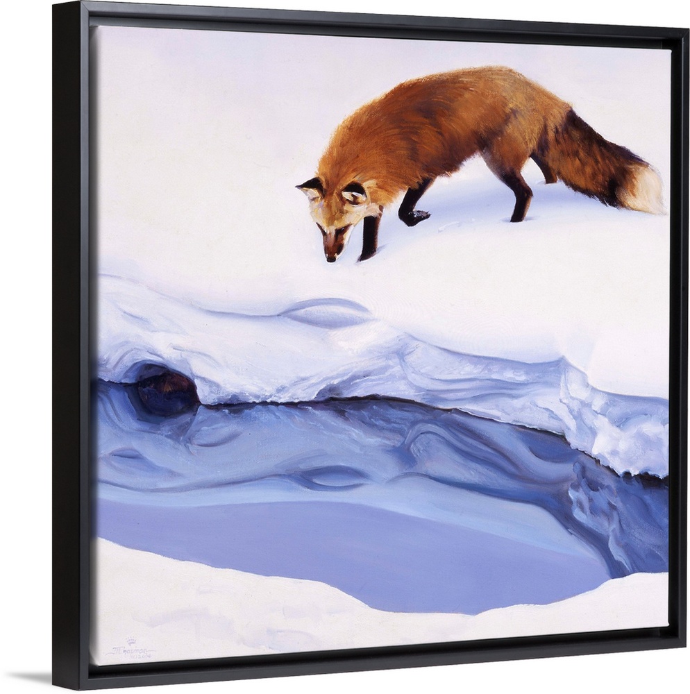 <p>Contemporary artwork of a red fox looking at a creek in thick snow.</p>