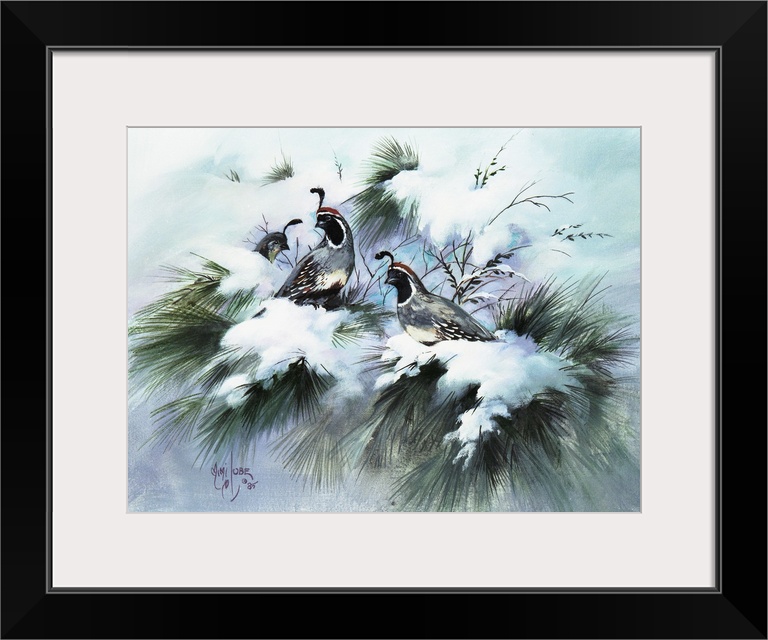 <p>Contemporary painting of quails resting in a snowy patch of grass in winter.</p>