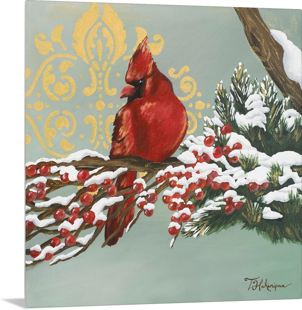<p>Decorative artwork of a cardinal perched on a snowy branch with a gold damask in the background.</p>