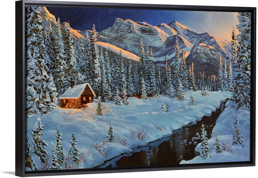 Cottages Art Cabin Wall Art Contemporary Art Four Seasons Winter Andrew Kiss Landscapes Mountains River, Creek and Stream Snowscapes Trees Forest Painting