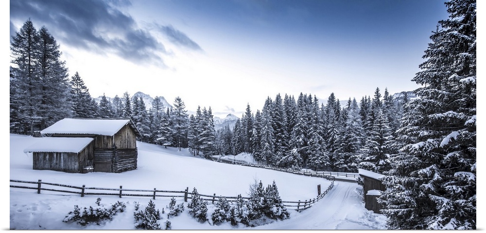 <p>Winter scene looking down a country road at a log cabin surrounded by snow covered pine trees in Val Badia at the foot of the Dolomites in the Alto Adige Region, San Cassiano, South Tyrol, Italy</p>