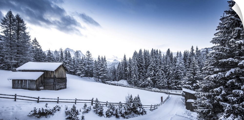 <p>Winter scene looking down a country road at a log cabin surrounded by snow covered pine trees in Val Badia at the foot of the Dolomites in the Alto Adige Region, San Cassiano, South Tyrol, Italy</p>