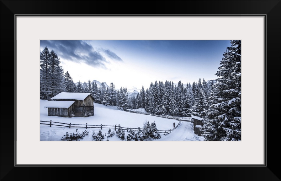 <p>Winter scene looking down a country road at a log cabin surrounded by snow covered pine trees in Val Badia at the foot of the Dolomites in the Alto Adige Region, San Cassiano, South Tyrol, Italy</p>