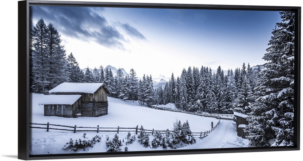 <p>Winter scene looking down a country road at a log cabin surrounded by snow covered pine trees in Val Badia at the foot of the Dolomites in the Alto Adige Region, San Cassiano, South Tyrol, Italy</p>