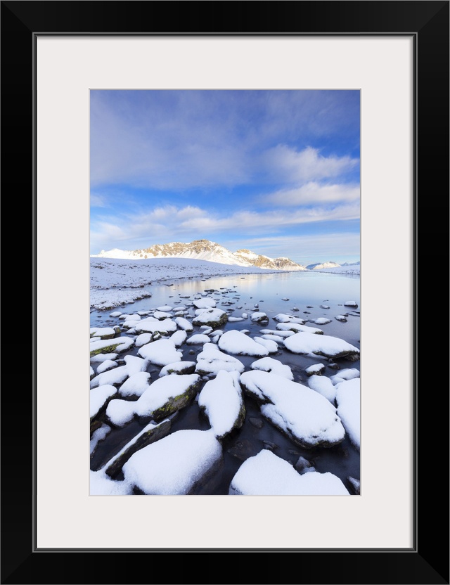 <p>Winter scenery with frozen alpine lake, Stelvio Pass, Valtellina, Lombardy, Italy, Europe</p>