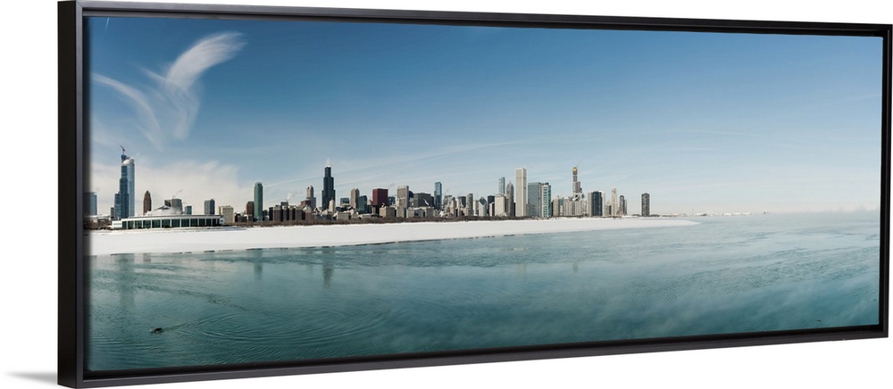 <p>Winter Scenery With Frozen Lake And Chicago Downtown Skyline Panorama</p>